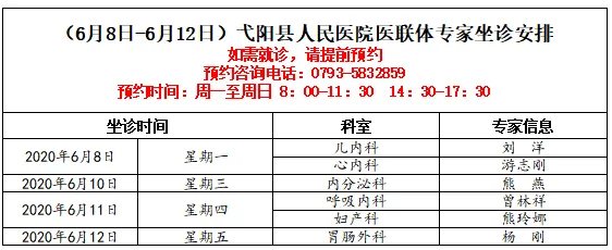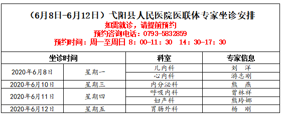 弋阳县人民医院是南大二附院紧密型医联体合作成员单位,目前南大二附院在心内科、儿内科、内分泌科、呼吸内科、胃肠外科、妇产科六个专业派驻专家到弋阳县人民医院长期坐诊及手术,让弋阳县人民不出家门就享受到了省级专家的医疗服务。现将6月份(6月8日-6月12日)专家坐诊信息通知如下,请有需要的患者前来咨询就诊。