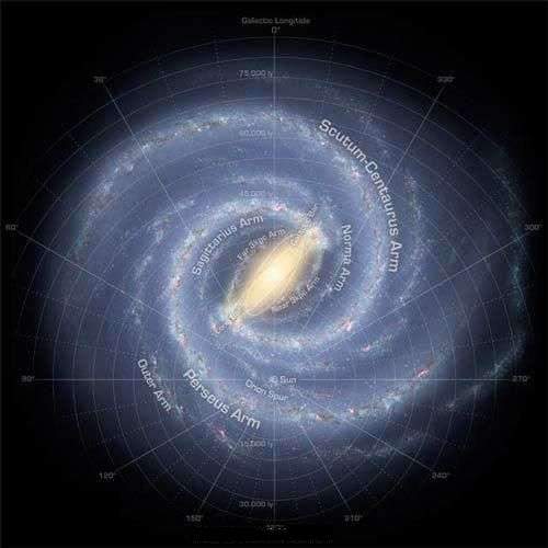 (模拟银河系俯视图:银河系中心超级黑洞、银河系旋臂、银河系边缘)