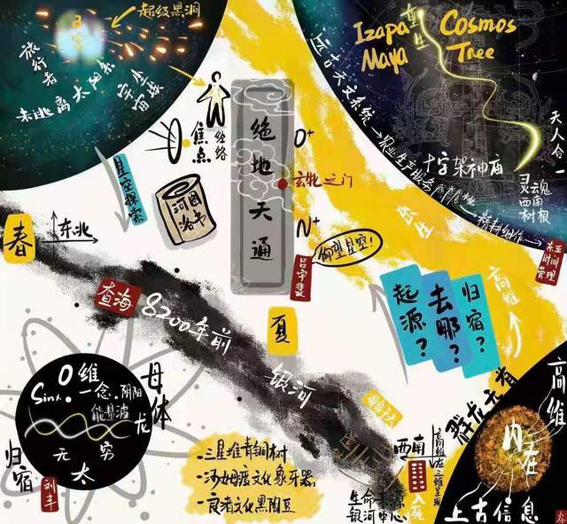 四川三星堆的青铜神树,也是银河为核心的宇宙树,寄托着远古先人对生与死的理解,述说着他们的生死观、宇宙观。吕宇斐先生认为中美洲玛雅文明的“宇宙树(cosmos tree)”,就是继承了8000年前的东亚宇宙模型:横枝代表黄道,是太阳的运行轨道;纵轴代表银河;树顶是鸟,代表北斗之神重归于树;眼睛是太阳,代表黄道坐标体系;树干是银河,树根处是冥界。