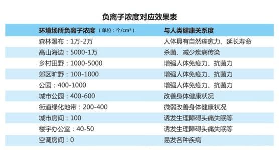 根据联合国卫生组织的标准,空气中负离子含量达到每立方厘米1500个时是空气清新的标准 达到每立方厘米2万个以上 则具有医疗保健的功效。中国长寿村广西巴马,负离子平均高达1万-2万个每立方厘米,那里常年居住着大量前去疗养的“候鸟人”,这些候鸟人中患有呼吸道不适及各种慢性病的人群占大多数,负离子浓度高是其中重要的因素之一,负氧离子浓度越高空气会越好。