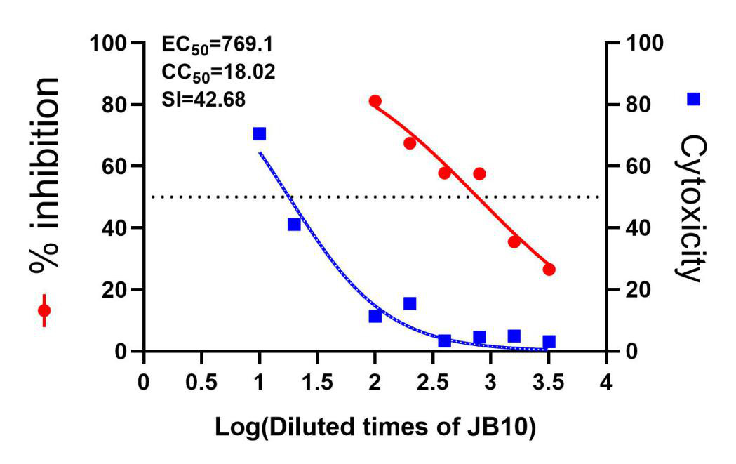 使用CCK-8试剂盒评价解本10号对Vero E6细胞的体外毒性作用。从图1可以看出,解本10号在浓度超过100倍稀释时,对Vero E6细胞没有明显毒性损伤。半数毒性浓度CC50为稀释18.02倍。根据以上结果,将解本10号稀释100倍以上,进行抗病毒活性实验室。实验步骤根据Wang等报道的方法略作修改,将Vero E6细胞以0.05的感染倍数(MOI)用SARS-CoV-2进行感染,然后用不同浓度的解本10号(稀释至100、200、400、800、1600和3200倍)下处理感染后的细胞,通过实时定量RT-PCR(qRT-PCR)检测细胞上清中病毒的拷贝数,评价病毒的复制情况。如图1所示,解本10号对SARS-CoV-2具有很强的抑制作用半数有效浓度EC50为稀释769.1倍,选择指数为42.68。这些结果表明解本10号具有开成为COVID-19治疗的候选药物的潜力。