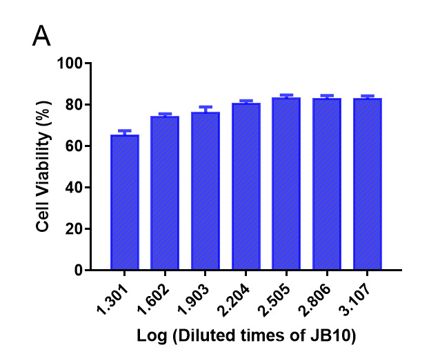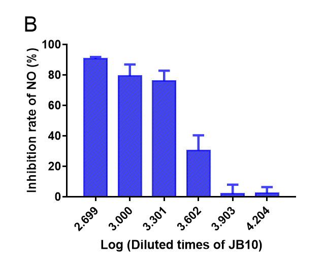 细胞因子风暴和过度肺部炎症,是导致COVID-19感染者病情严重和死亡的重要原因。据报道,控制COVID-19的局部和全身炎症反应可能与抗病毒治疗一样重要。解本10号的抗炎活性根据Liu 等报道的方法进行测定。在抗炎实验开始前,用MTT法检测解本10号对RAW264.7细胞株的毒性。如图3A所示,解本发酵液稀释160倍以上,对RAW264.7细胞没有明显毒性。 用稀释500、1000、2000、4000、8000和16000倍的发酵液,处理LPS诱导的RAW264.7细胞,检测细胞分泌NO的情况,评价解本10号的抗炎活性。从图3B可以看出,解本10号可有效地抑制NO的产生。当解本10号稀释至2000倍时,NO抑制率仍接近80%。这些结果表明解本10号具有很强的抗炎活性。