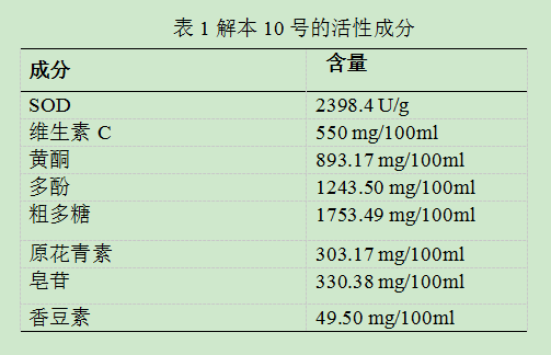 由于解本10号具有较强的抗新冠病毒活性、抗氧化活性和抗炎活性,我们对其成分进行了分析,为解本10号的作用机制提供依据。由表1可知,解本10号含有维生素C、SOD、黄酮、多酚、粗多糖、原花青素、皂苷、香豆素等多种活性成分,而这些物质具有抗氧化、抗炎、调节免疫、抗病毒等作用。