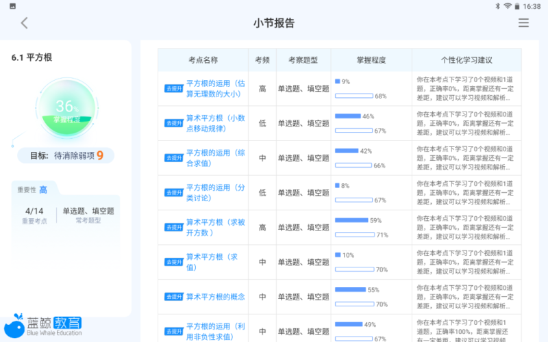报告详细分析了刚刚答过的十道题,分别对应哪些知识点、考频、考察题型、掌握程度,并给出个性化的学习建议。