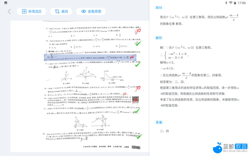 在批改完成后,点击每道题,T10都会在右侧给出题目和解析,解析步骤很详细,比较方便。但在实际操作时,我们也遇到了一些问题。如在批改时,因为扫描精度问题,导致批改出现失误的情况。