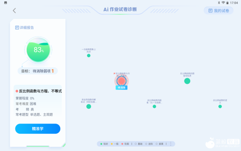这一功能可为孩子们提供数理化生英语5个学科的图谱体系,不仅可以通过测试来生成检测图谱,也可以拍摄初中数学试卷直接生成。