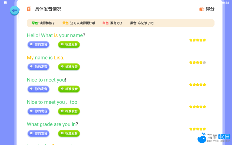 在AI对话实战中,会有一位AI虚拟外教1对1领读发音,孩子需要根据语音和屏幕上的文本来复述。T10会给出一个非常直观的星级评价。倘若发音未达到5星则会被要求再复述一遍。