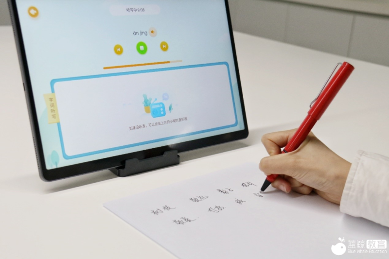 呼唤出语音助手,发出“帮我报听写”的指令,T10会按照孩子和家长选择好的生词库开始听写。同时,发音次数,间隔时长,语速都是可以根据孩子自身需要调节。听写可以通过作答笔在屏幕上进行,也可以在纸上进行,屏上听写可以直接批改,纸上听写完成后,可以将纸放在学习机前,点击批改,就能得出批改结果。