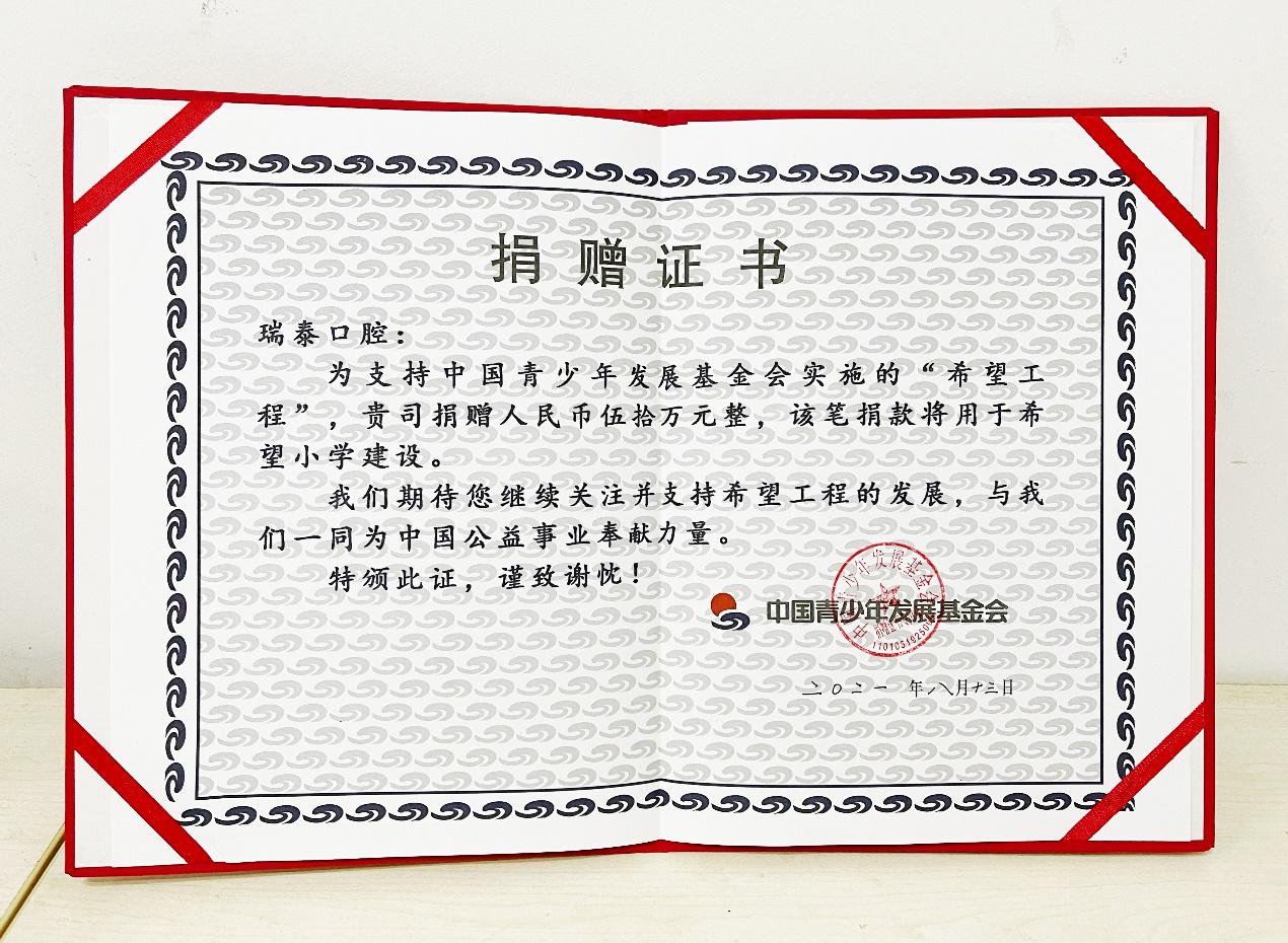 瑞泰口腔援建希望工程,助力公益事业不停歇