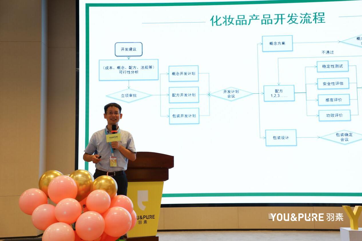 在当天会议上,特邀暨大基因副总经理兼化妆品研发中心总监刘忠教授从专业人士的角度,讲解了产品专业度的组成因素,以及高质量的产品上市前需要经过的检测与流程。