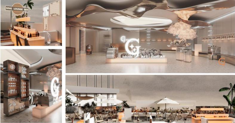 高格丽特,将此次风格取名为The Desert Bloom,喻为在沙漠中盛开。整体空间的色调以荒原的颜色为基础,墙顶地一体,大面积的艺术漆营造出荒漠的苍凉感,而一贯提倡生物科技美肤的格丽缇品牌,正在此盛开。