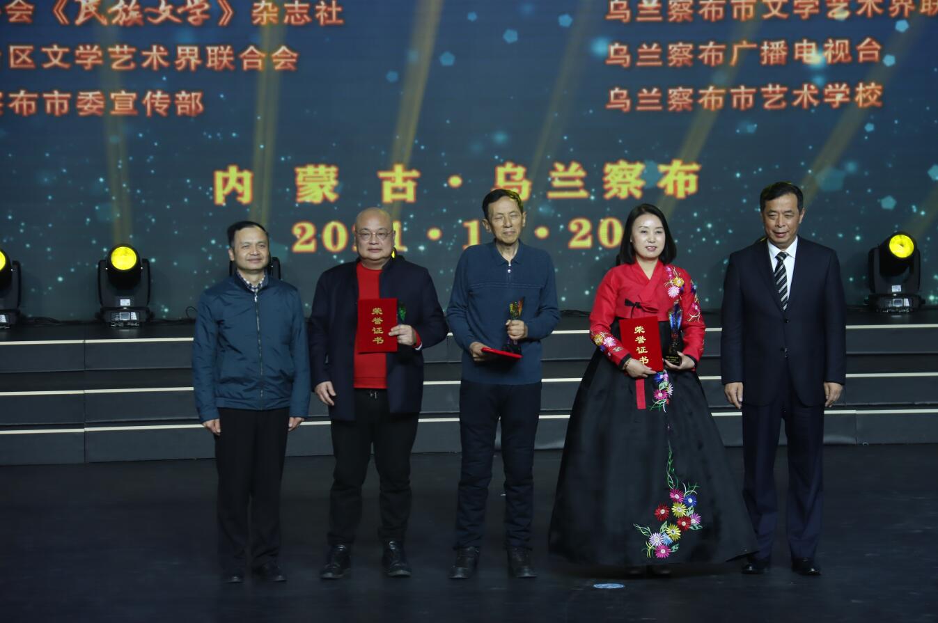 中共乌兰察布市委常委、宣传部部长岳艳美、《民族文学》杂志社主编石一宁分别致辞,内蒙古文联党组成员、副主席闫艳等为“2020《民族文学》年度奖”获奖作家颁奖。《民族文学》杂志社并向乌兰察布市文联赠送了《<民族文学>精品选》图书,向乌兰察布市兴和县、乌兰察布市察右中旗交授了《民族文学》乌兰察布市创阅中心牌匾。