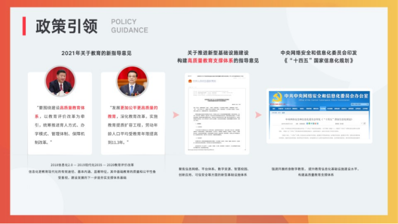 这个背后的根本原因是,数字化是提升生产效率,推动各行业进一步发展的最有效的手段之一。而教育信息化的本质就是通过技术手段和优质的服务,来提高学校的教育水平和效率,为老师、学生和家长减轻负担,这与“双减”政策的目标是一致的。
