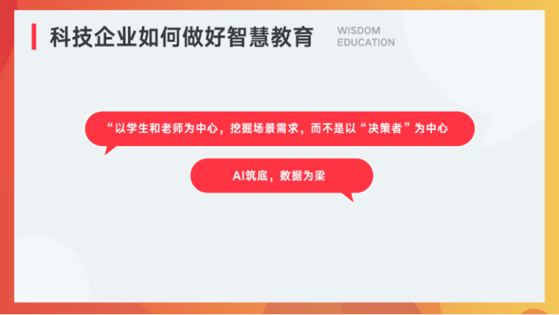 教育信息化很庞杂,路子也很多,我们很清楚卖关系不是我们的优势,卖参数也不是我们的方向。作为互联网科技企业,我们很明确,我们是要以一线的使用者(老师学生)为中心,挖掘场景需求,而不是以“决策者”为中心。
