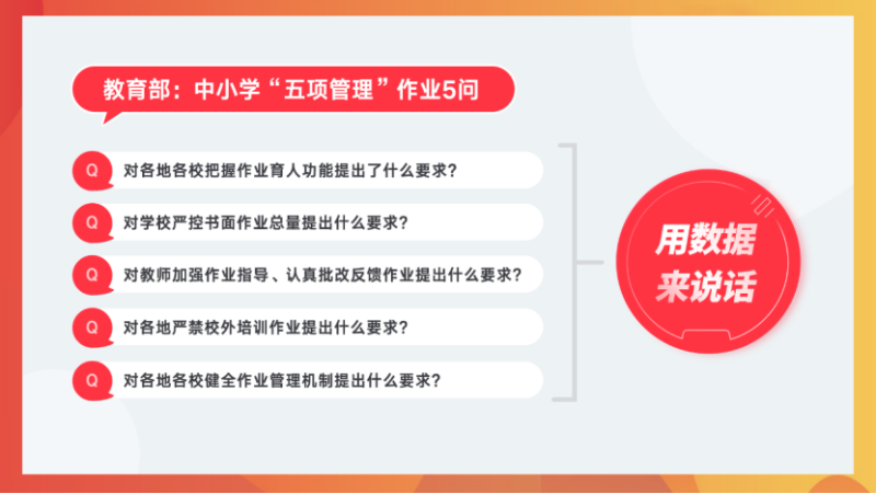 教育部五项管理里面,作业管理有“五问”,概括来讲就是,作业是一个技术活,作业的管理需要通过采集数据来总揽全局。如果各个学校、班级、区域要实现作业减负,就要用数据来说话,来表现作业是怎么减负的,效果怎么样。