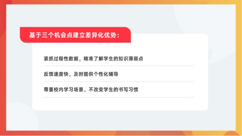 其次,相比传统的阅卷机只能采集阶段性的学习数据,我们的产品反馈速度更快;