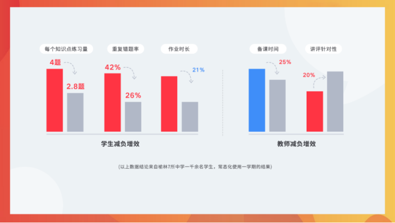 再看下我们的产品在陕西榆林的试点效果,我们目前已经在榆林市第一中学、榆林市第四中学等7所学校常态化试点应用,累计覆盖21个教学班,1106名学生。经过我们的统计和调查问卷回访,目前部分使用有道智能学习终端的学校班级,学生作业量整体减少约30%,作业时长减少约21%,学生在某一个知识点的重做错误率从42%降低到26%,每个知识点的练习量由原来的4题缩减至2.8题,减少30%。同时我们也了解到,老师的备课时间降低了25%,讲评的针对性却提高了20%。