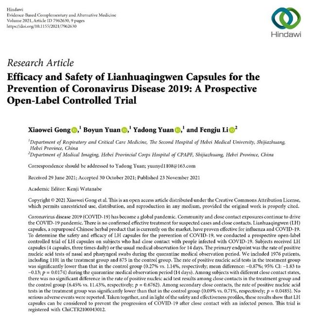 日前,国际医学期刊《循证补充和替代医学》刊发了一篇题为《连花清瘟胶囊预防新型冠状病毒肺炎》的临床研究论文。研究人员选取了1976例与新冠肺炎感染者有密切接触的受试者,分为连花清瘟治疗组(1101例)和对照组(875例)给予对照试验,并于14天后检测鼻咽拭子核酸检测阳性率。研究结果显示,治疗组核酸检测阳性率显著低于对照组(0.27% vs.1.14%),同时用连花清瘟预防新冠具有良好的安全性。