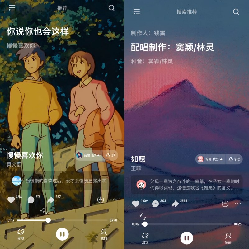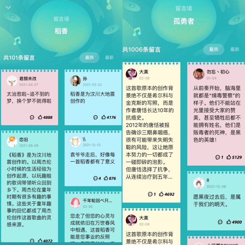 另一方面是“高山流水”式的共鸣情感。基于用户生活环境与阅历的不同,对于同一首音乐会产生不同的情感与理解,通过“评论外显”与“氛围评论墙”的联动,可以轻松找到自己的“同频者”,找到知己般的情绪共鸣点。