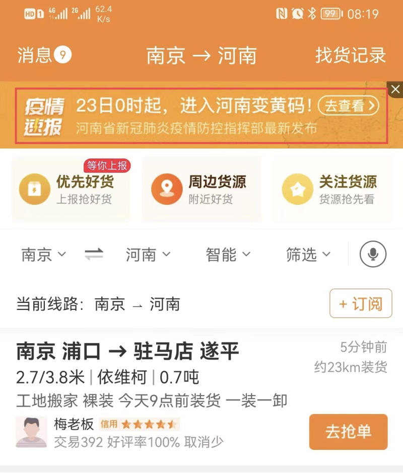 政策发布之后,为了让河南地区司机以及河南籍司机及时了解抗疫政策,满帮平台连夜成立项目组,在和河南相关的货源旁边紧急增加防疫提醒,通知即将进入河南或计划进入河南的司机,及时掌握防疫信息,做好相关准备,避免影响正常生活安排和相应的订单运输。