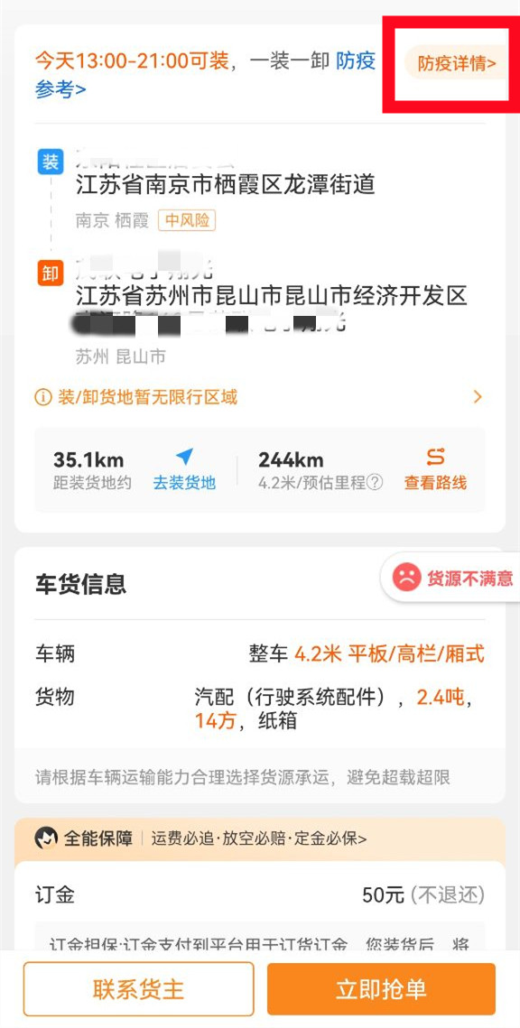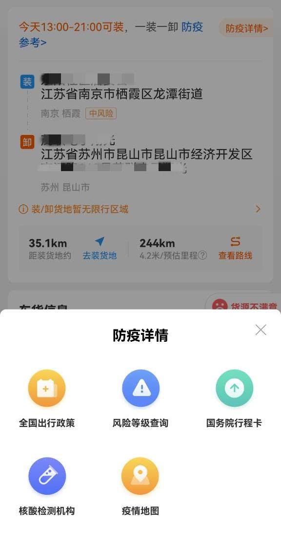 货源详情页面可查询各地防疫政策