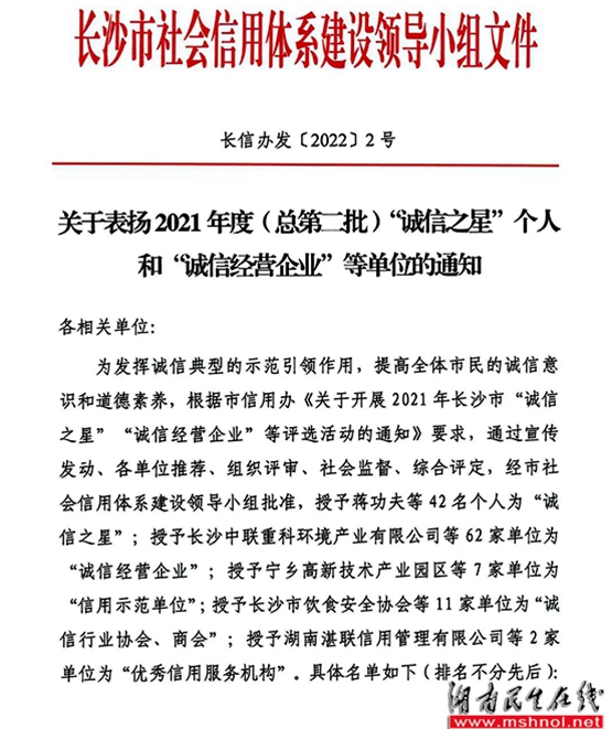 近日,长沙市社会信用体系建设领导小组办公室发布《关于表扬2021年度(总第二批)“诚信之星”个人和“诚信经营企业”等单位的通知》,绿之韵集团董事长胡国安凭借引领企业在诚信体系建设领域所取得的优异成果受到政府表彰,荣获长沙市“诚信之星”荣誉表彰。