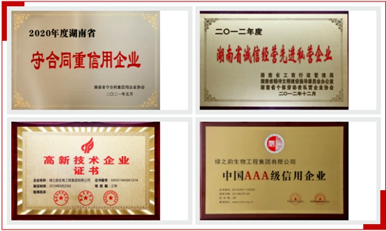 “和诚立信,竞超兴业”是绿之韵集团秉承的经营宗旨和行动准则。十九年来,绿之韵集团在胡国安董事长的引领下,坚持以规范为根本、以责任为使命、以品质为生命,立足健康可持续发展,维护消费者合法权益,传递行业正能量,不仅在企业品牌、战略、管理、文化等方面实现了大幅度提升,而且还不遗余力地为行业培养了许多行业精英人才,为民族品牌的良性发展与崛起贡献了自己的力量。绿之韵连续十多年被授予“湖南省守合同重信用单位”,连续多年被授予纳税信用A级荣誉,先后获评“中国驰名商标”“国家高新技术企业”“中国企业诚信经营示范单位”“中国AAA级信用企业”“湖南省诚信经营先进私营企业”“湖南省著名商标”“湖南名牌”等多项殊荣。胡国安董事长个人先后被授予“全国优秀中国特色社会主义事业建设者、全国先进爱国企业家、全国优秀民营企业家、共青团中央“第四届中国青年创业奖”、共青团中央“希望工程25周年杰出贡献奖”、中华慈善总会“中华慈善突出贡献奖”、湖南省“五一”劳动奖章、湖南省“百名最美扶贫人物”、CCTV感动中国(湖南)十佳人物、湖南省人民政府颁发的一等功、长沙市人民政府颁发的二等功等国家、省市各级各类荣誉200多项。
