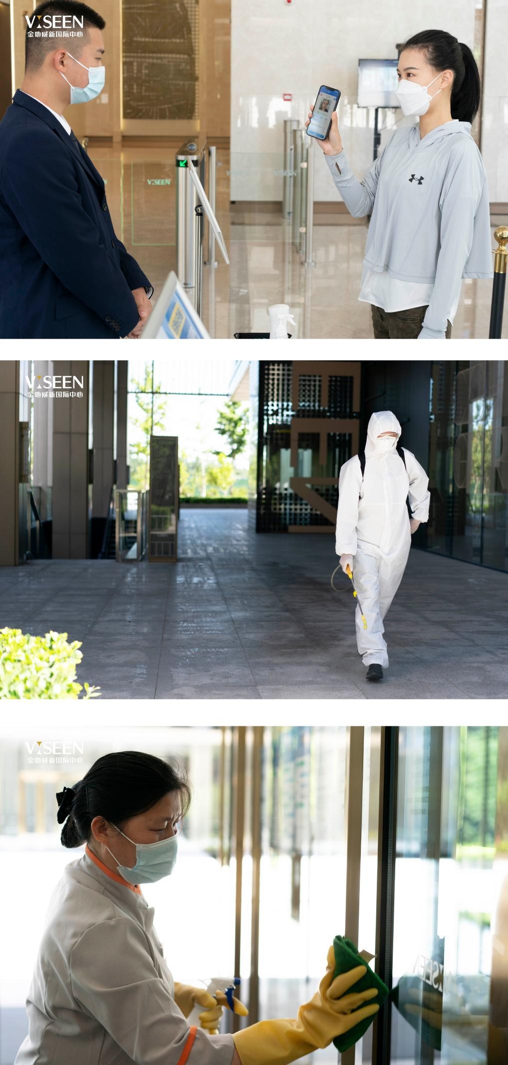 特殊期间,金地威新国际中心严格执行政府相关规定,专人专岗把控复工人员与入园流程,正确佩戴口罩,出示健康码、行程码以及72小时核酸阴性证明,并对园区内外公共区域及办公区域进行定时消杀工作,精准、细致地对写字楼电梯、卫生间、楼道等场所进行无死角消毒,悉心守护员工及入驻企业,全力打造安全的办公环境。