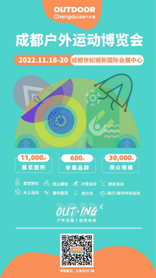 感受更多户外运动方式、结识更多运动好友,尽在11月18号2022成都户外展。现距离展会开幕只剩100天,报名通道已开启,抓紧时间登记领取门票,带上小伙伴,共赴这场户外嘉年华吧!
