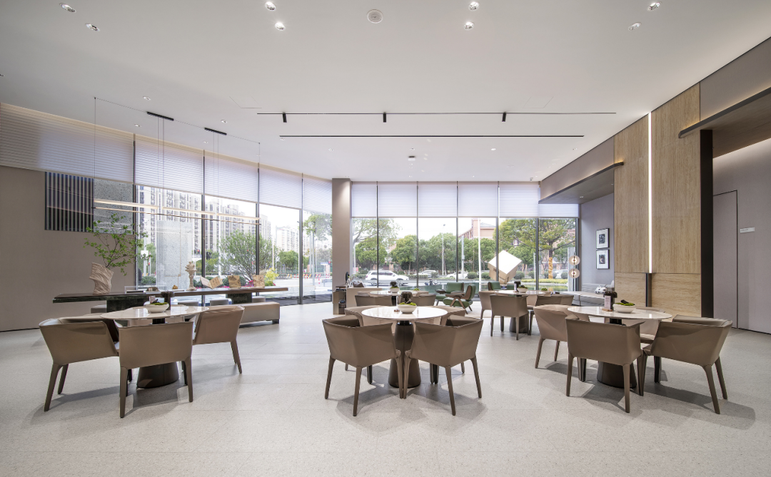 以意大利宗师斯卡帕大师设计理念为灵感源泉,以精致的设计成就经典的重构。大体块的整体架构,与大面玻璃的设计结合,整个空间充盈着现代作品独有的丰盈光线质感。