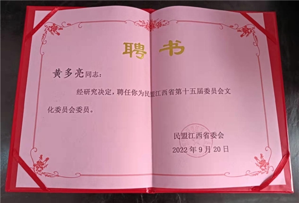 近日,民盟江西省委会文化委员会工作会议在南昌滨江宾馆召开,会议研讨交流了本年度专委会的工作以及调研课题、社情民意信息撰写、专委会活动等。会上,盟省委领导向第十五届委员会文化委员会委员颁发了聘书,抚州盟员黄多亮受聘担任民盟江西省委第十五届委员会文化委员会委员。江西省政协副秘书长、民盟江西省委会专职副主委刘新农为黄多亮颁发了聘书。