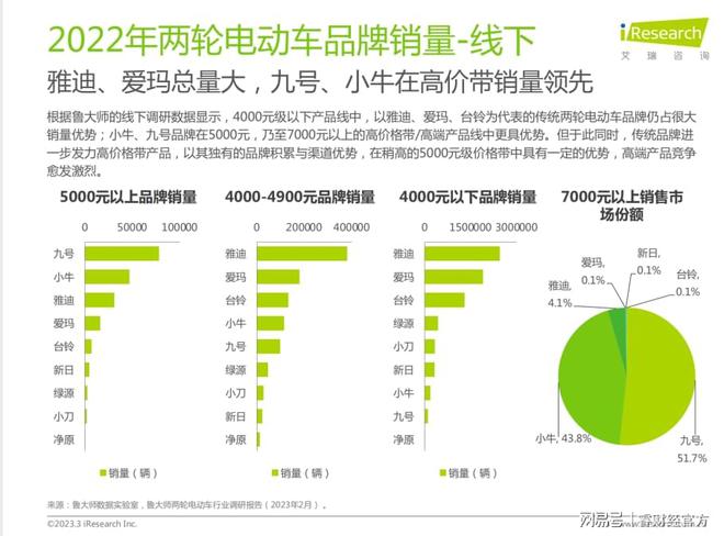 最直接能展现品牌实力和口碑的就是销量数据。艾瑞最新发布了《中国两轮电动车行业白皮书》,精准的数据向我们展示了电动两轮车行业几大品牌的市场地位。在这其中,九号电动多项第一的成绩迅速“出圈”, 包括在5000元,乃至7000元以上的高端产品线中均保持销量第一,从而在这场无硝烟之战中拔得头筹。
