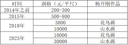 杨开刚老师的作品在2014年之前,仅仅只有二三百一平尺,2015年是500-800/平尺;2019年,花鸟画是3000/平尺,山水画10000/平尺;而到了2023年,花鸟画目前是10000/平尺,山水画达到了30000/平尺。在短短的几年时间里,其作品的市场价值翻了十几二十倍,并且价值提升的速度是越来越快越来越高。上升的势头非常的强劲 迅猛,甚至连年翻着跟头上涨。