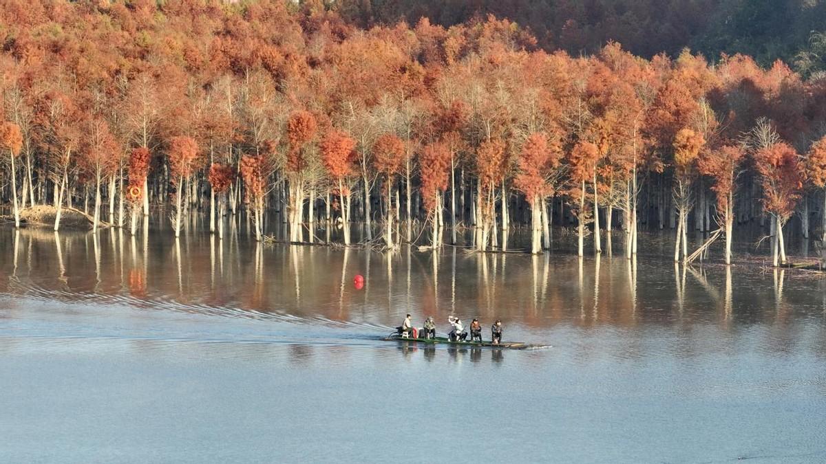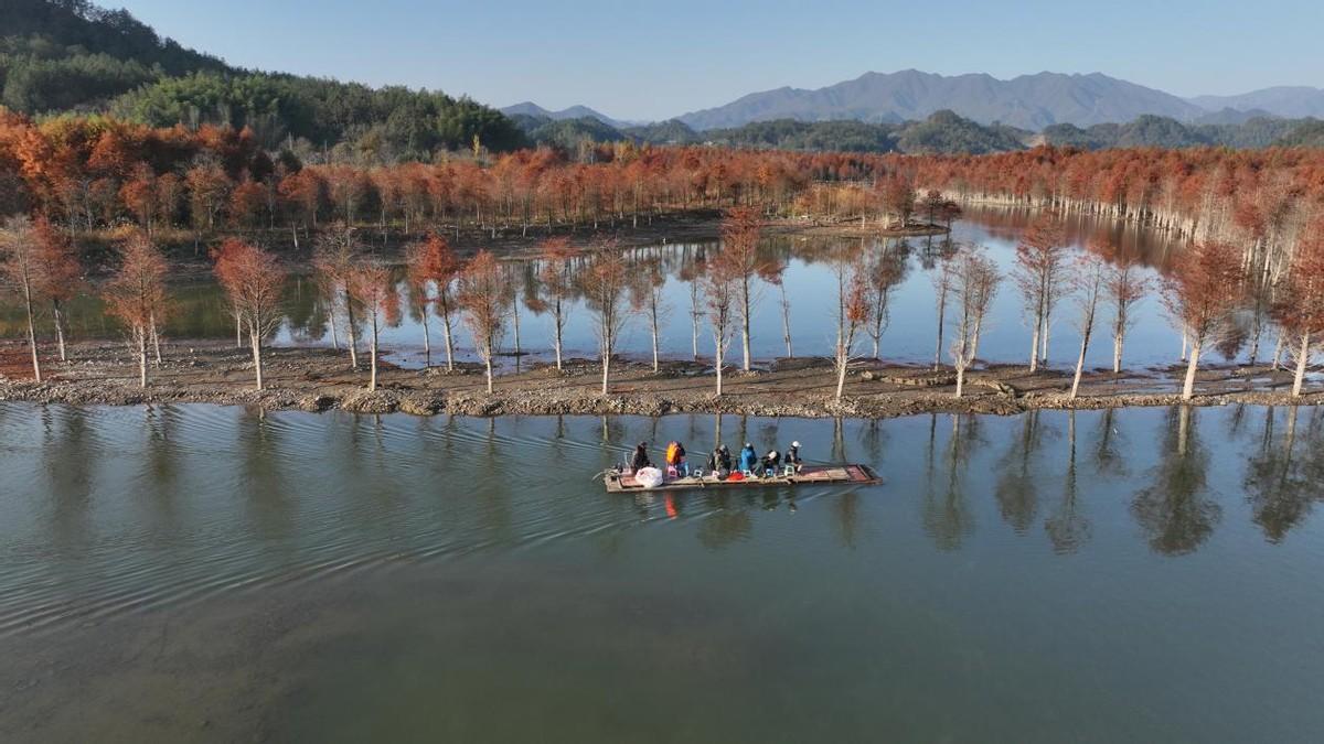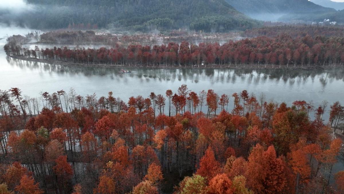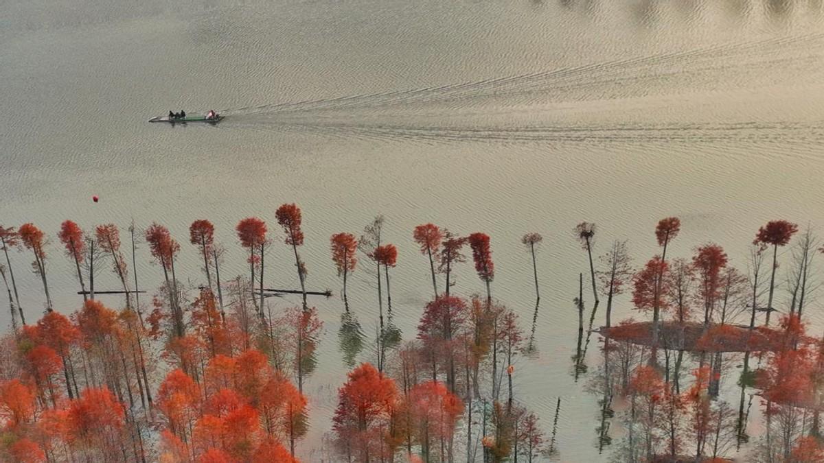 位于安徽省宁国市方塘乡的两千余亩落羽杉林迎来了一年中最美的时节。一丛丛红杉林错落有致地立在水中,与清澈的湖水相互掩映。那鲜红的色彩,尤如油画般的美丽。