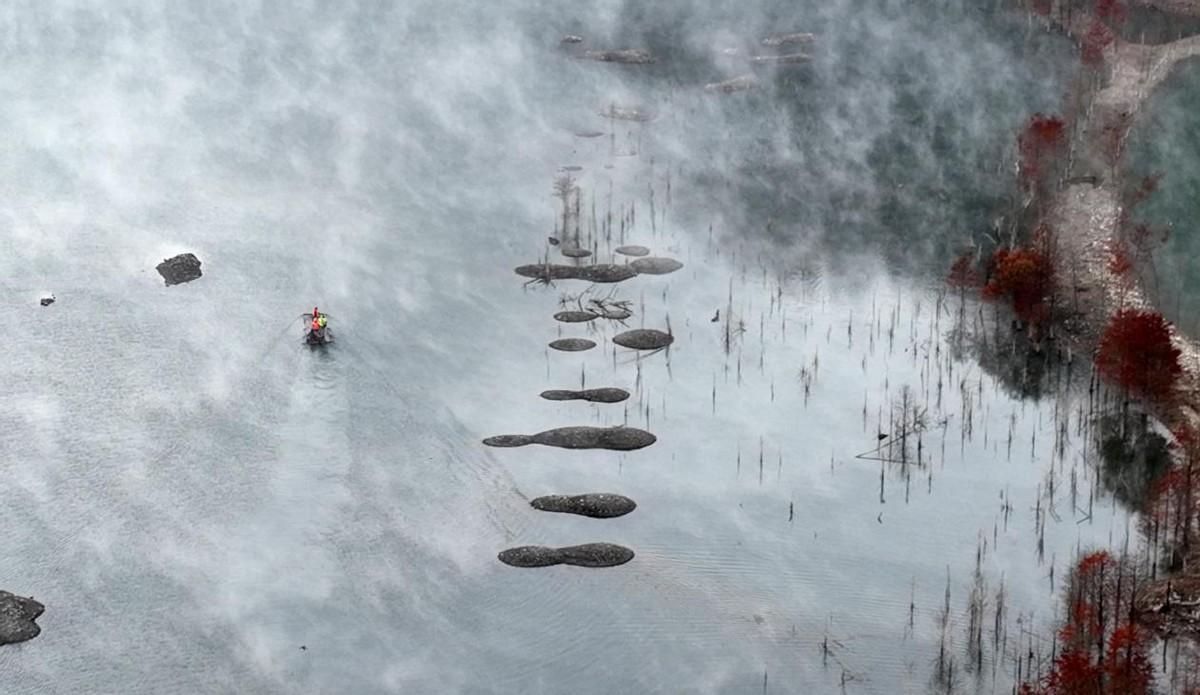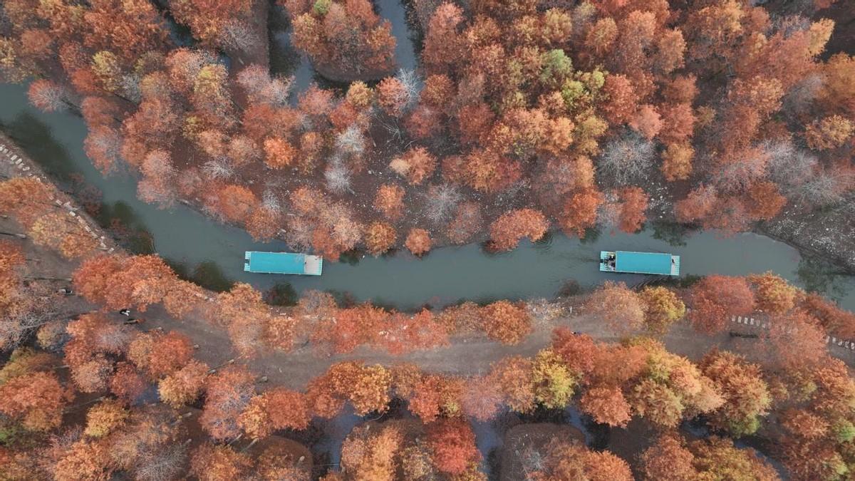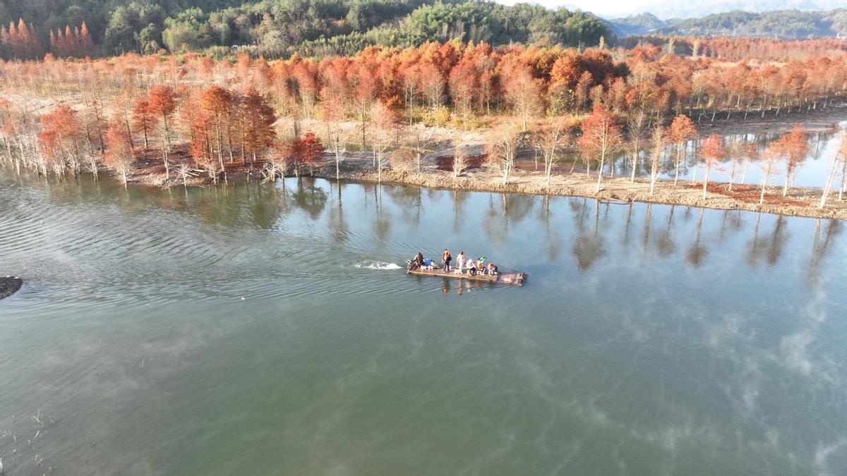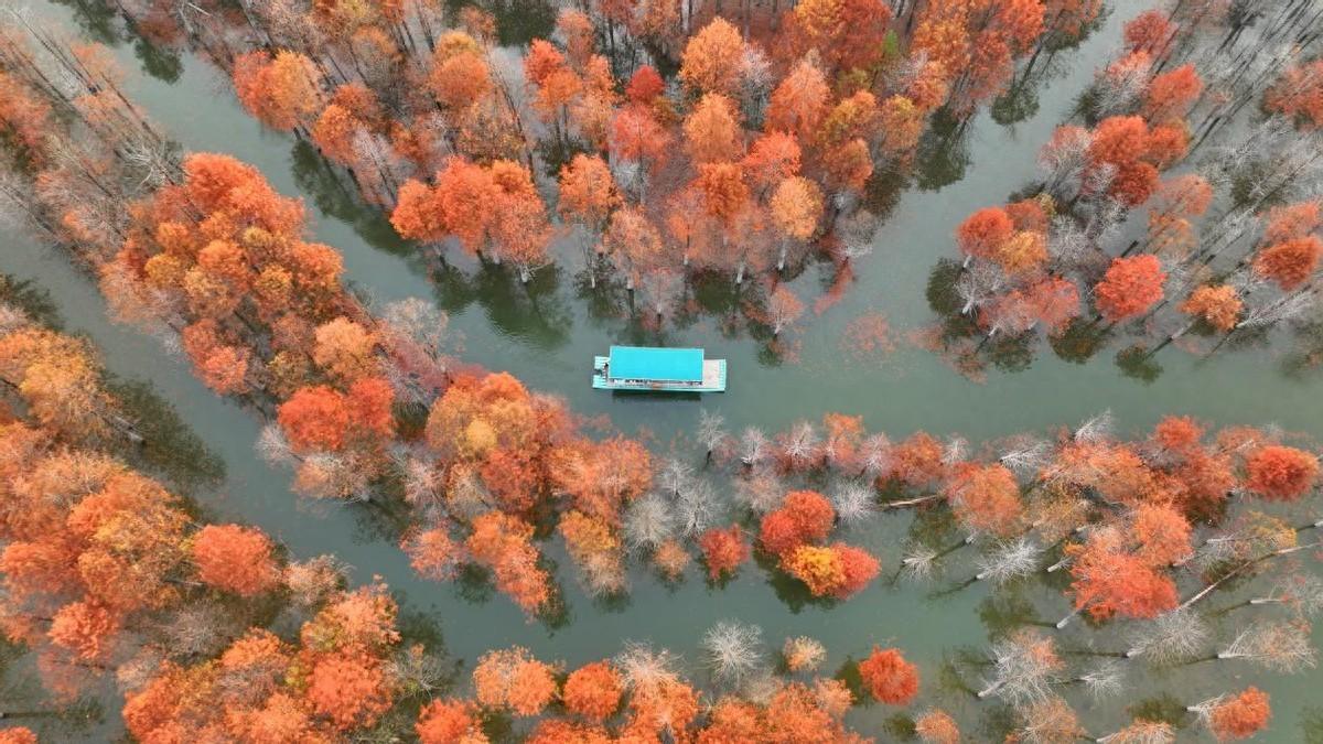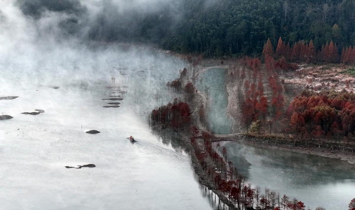 位于安徽省宁国市方塘乡的两千余亩落羽杉林迎来了一年中最美的时节。一丛丛红杉林错落有致地立在水中,与清澈的湖水相互掩映。那鲜红的色彩,尤如油画般的美丽。