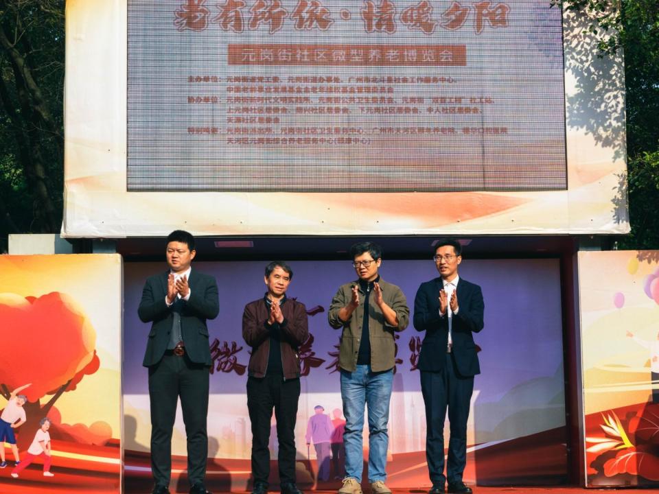 天河区民政局副局长刘秋生(左二)、元岗街道党工委副书记赵琦(右二)、中国老年维权基金委员会 幸福金龄工作组主任高峰(左一)、广州市北斗星社会工作服务中心理事长梁国勇(右一)为元岗街社区微型养老博览会揭幕。