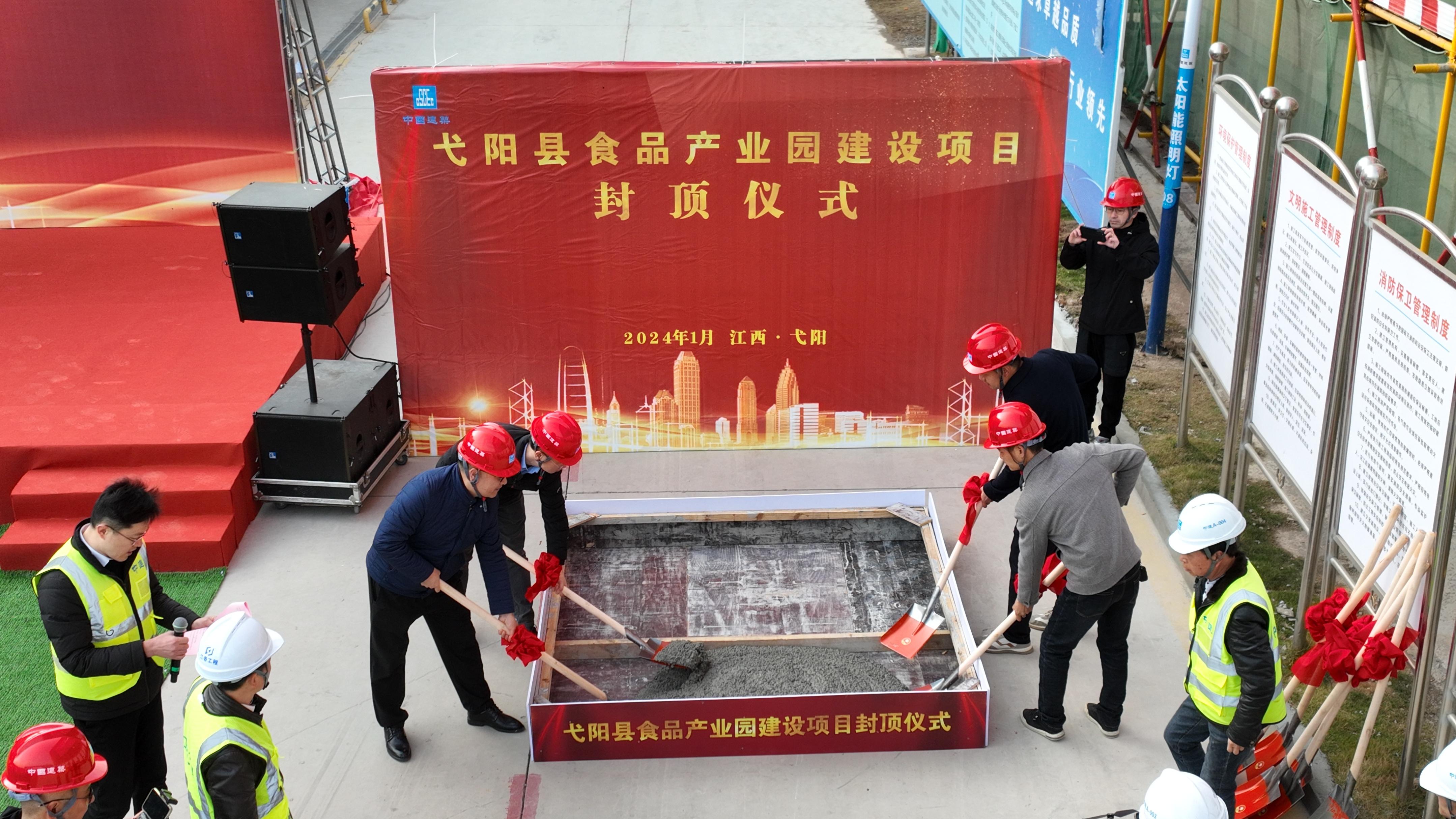 中建三局集团有限公司承建的弋阳县食品产园建设项目,2023年5月进场施工,600多人员奋战一线,历时7个多月,于2024年1月15日完成主体结构封顶。