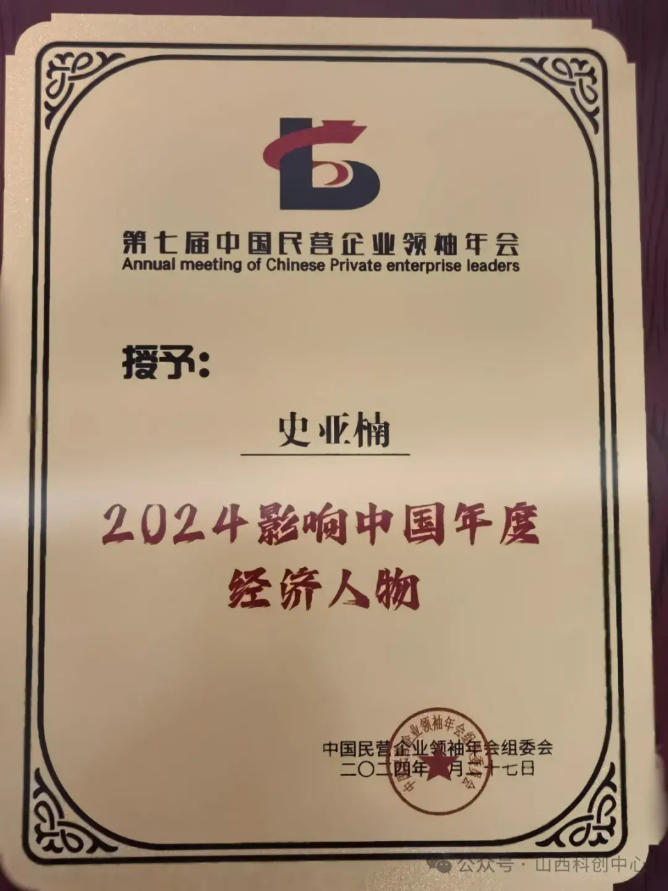 4月27日,由中国国际经济合作学会产业经济工作委员会、环球精英杂志社、北京蓝源民族产业研究院共同主办的2024年第七届中国民营企业领袖年会在北京隆重举办。本次年会汇聚了众多知名民营企业家、政府官员、专家学者和媒体人士,共同探讨民营企业的发展前景、创新路径和社会责任。山西扶摇而上商业管理集团有限公司董事长史亚楠受邀参加并获得两项荣誉证书。