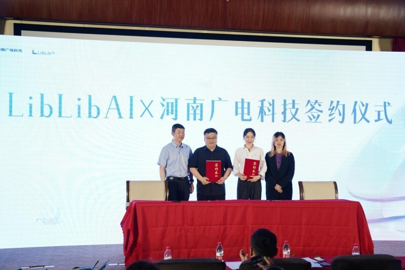 仪式上,河南广电科技有限公司执行董事兼总经理陈宁,LiblibAI商务总监褚洁代表双方签署了战略合作协议。