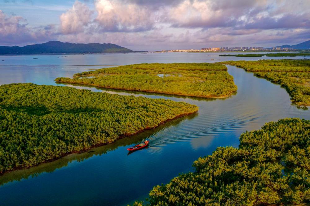 在陵水红树林国家湿地公园,翠绿的树木与碧蓝的海水交相辉映,白鹭成群翩翩入画,构成了一幅人与自然和谐共生的美景。