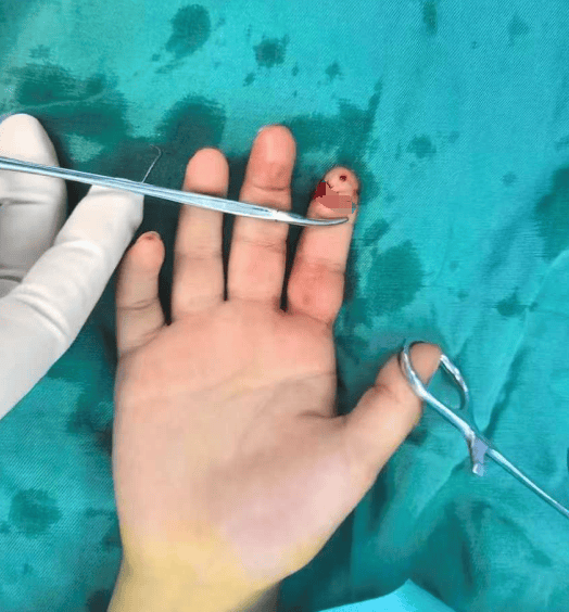 急诊医师详细查体后,初步诊断为 “右示指末节指尖完全离断伤”。纯纯右示指末节约 1/3 复合组织离断,残端指骨外露,累及甲床,周围局部皮肤挫裂伤,创缘不齐且中度污染,还伴有活动性出血。离断的指体色泽苍白,右示指虽然活动尚可,但末梢皮肤感觉麻木不适。
