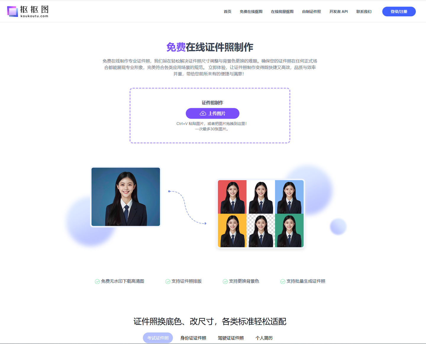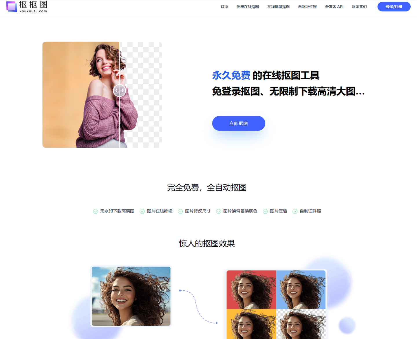 抠抠图是一个免费的在线AI批量抠图网站,它利用先进的图像识别技术,能够自动识别图片中的主体,并精确地将其从背景中分离出来。使用抠抠图,你只需上传图片,系统就会自动完成抠图工作,无需任何手动操作。它支持多种图片格式,并且可以一次性处理多张图片,非常适合需要快速批量抠图的场合。此外,抠抠图的界面简洁易懂,即使是非专业用户也能轻松上手。最重要的是,它完全免费,无需注册即可使用,是设计师、摄影师以及日常需要处理图片的朋友们的好帮手。下面来一一说下这个网站的全部功能。