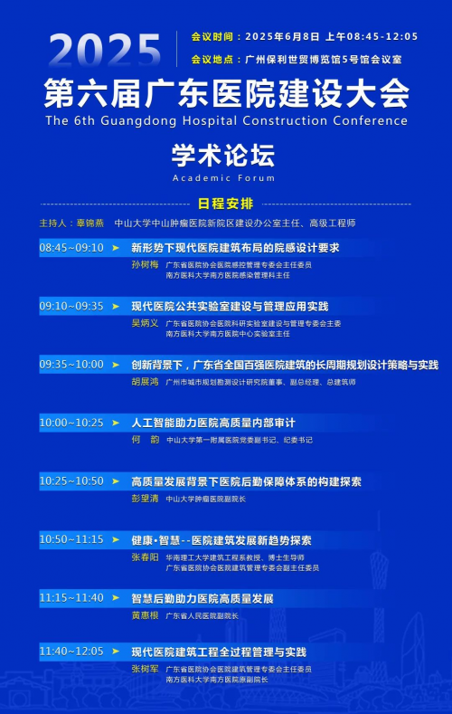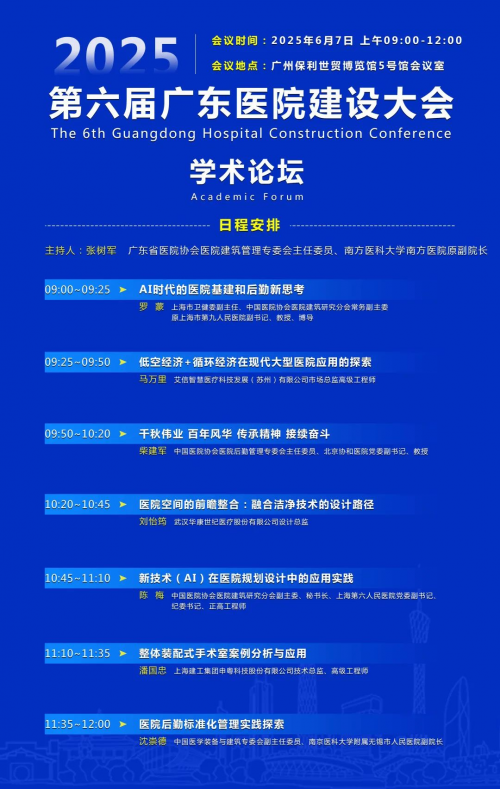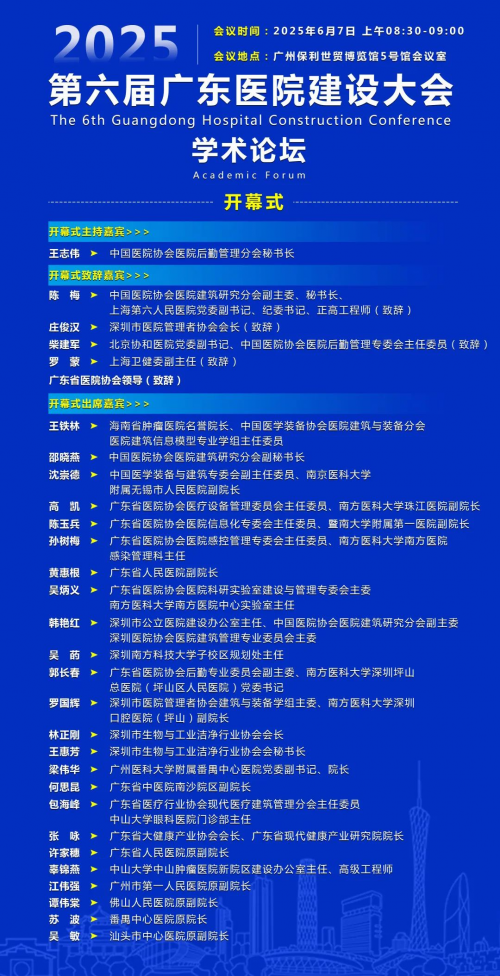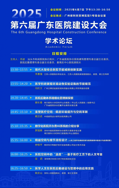 2025年6月7日至8日,以“温馨疗愈 · 低空物流 · AI新应用”为主题的第六届广东医院建设大会暨“院长论坛”在广州隆重举行。作为第36届中国(广州)国际健康产业博览会(以下简称:健博会)的核心学术引擎,本次“院长论坛”汇聚了全国顶尖医疗管理者与行业专家,以一场高浓度、前瞻性的思想盛宴,为健博会注入了澎湃的科技动力与深厚的学术底蕴。