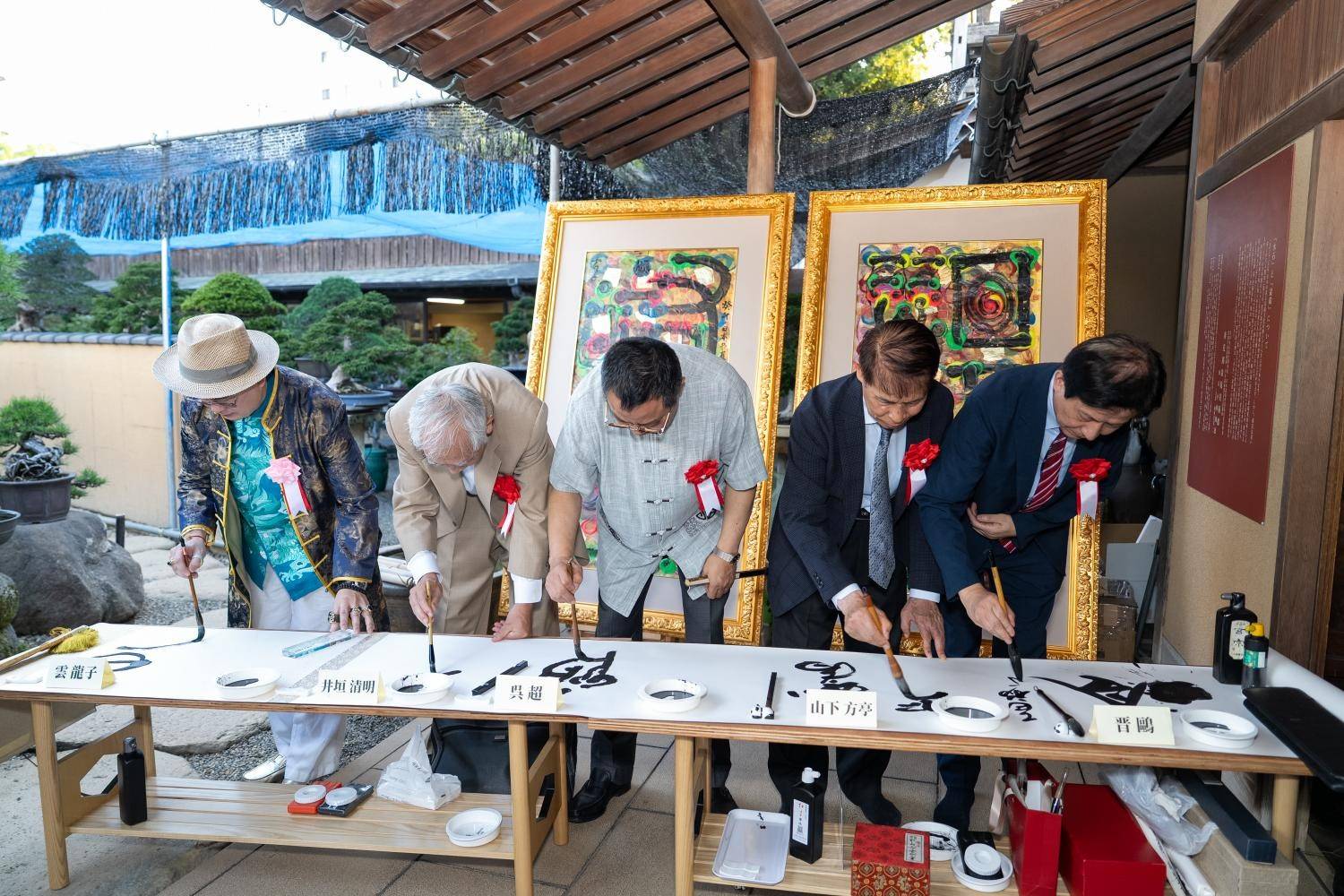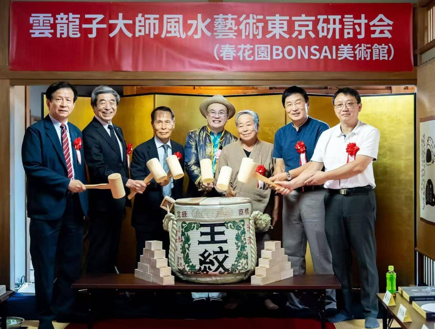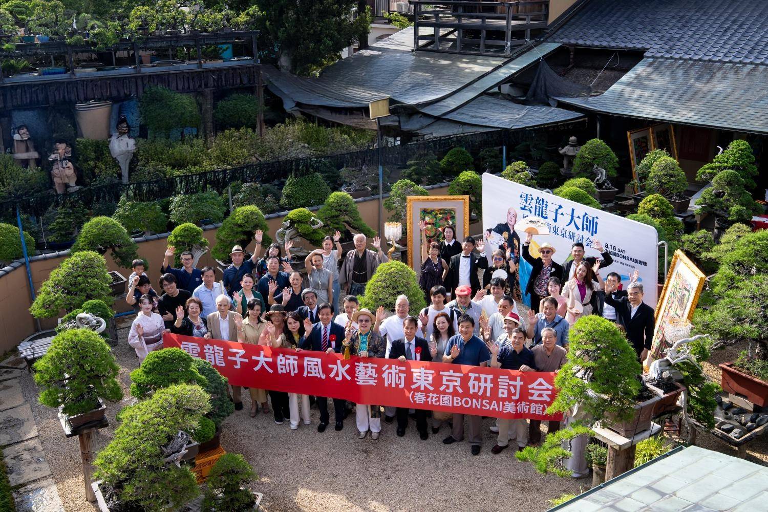 新加坡华人艺术名家云龙子风水书法研讨会8月16日在东京春花园盆栽美术馆举行,来自中日书画艺术界等嘉宾一百余人出席,分享融合在名贵盆栽新奇氛围中云龙子风水画作,沉浸在别开生面的多元艺术享受中。中国文化中心主任罗玉泉、日中友好会馆中国代表理事黄星原、日中友好协会原常务理事永田哲二、春花园盆栽美术馆园主小林国雄、西泠印社名誉理事、日本篆刻家协会原理事长山下方亭、日本华人文联主席、西泠印社理事晋鸥分别致辞,对云龙子风水书画精品与众多珍贵盆栽作品融为一体,美美与共创新布展表示赞赏,也期待云龙子的作品能与盆栽美术馆的作品珠联璧合,精彩夺目。罗玉泉、黄星原、小林国雄、山下方亭、永田哲二、晋鸥等与云龙子大师一起为庆贺此次活动“开镜酒“。